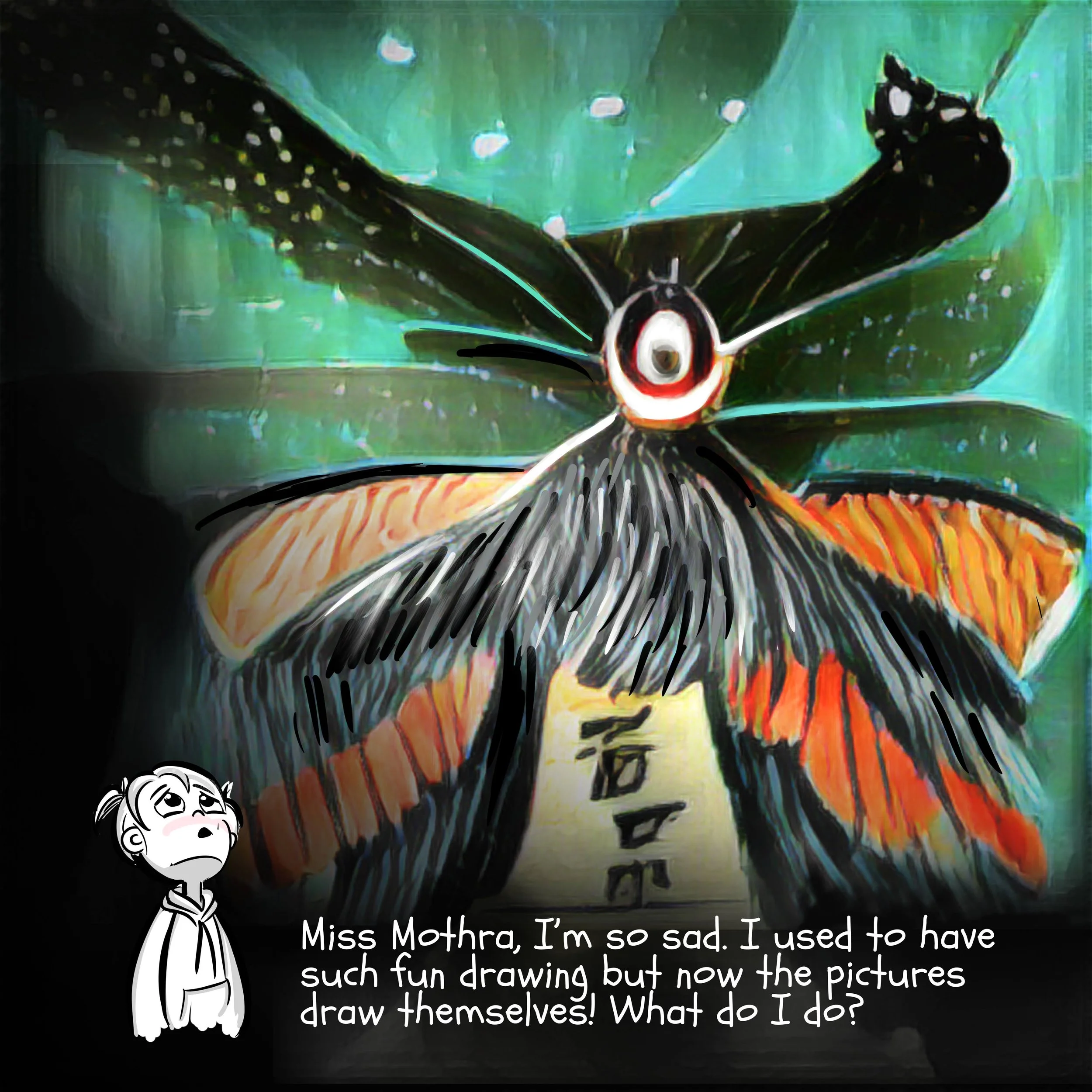 Individual elements were generated using Adobe Neo and Midjourney, then composited and refined in Photoshop, and finally painted over in Procreate. The goal was not automation, but authorship, using AI as a starting point while retaining intentional style and artistic control. This process struck a balance that felt right to me: expressive, deliberate, and unmistakably my own.